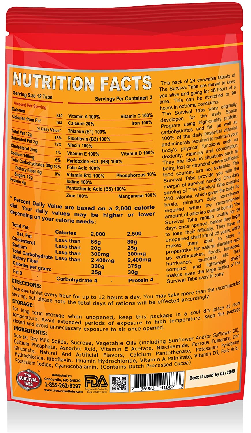 - Contains all the important nutrients your body needs for maximum functioning. survival tabs come in chewable, superb tasting tabs.