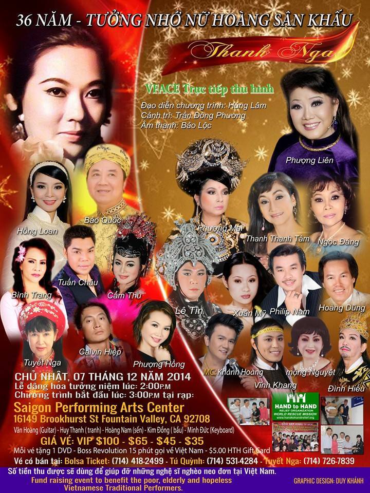 Kính mời quý khán giả đến tham dự chương trình cải lương kỉ niệm 36 năm tưởng nhớ nữ hoàng sân khấu Thanh Nga vào ngày Chủ Nhật tuần này ngày 07/ 12 lúc 2 h trưa tại Sài gòn Performaning Art . Chương Trình do Công Ty The Survival Tabs tài trợ. Xin mời Qúy khán giả đến xem chương trình và ủng hộ mua The Survival Tabs để chúng tôi gây quỹ từ thiện cho các nghệ sỉ cao tuổi tại quê nhà viêt nam. Chân thành cám ơn quí khán giả.
